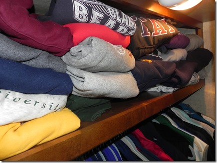 Of course, a good plan sometimes goes awry…we like to visit college campuses and I have gotten quite carried away and collected A LOT of college sweatshirts which definitely DO NOT occupy a small space!